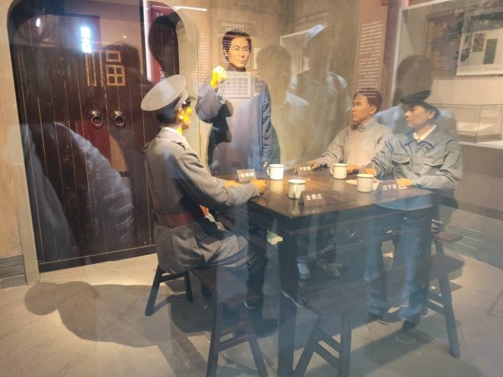 “星火钱塘”展厅里,现场还原了徐梅坤、于树德、金佛庄、沈干城4人在皮市巷3号开会,宣告中共杭州小组诞生的场景:栩栩如生的蜡像共有4人,围在一张方桌前,其中身穿西装高举右手意气风发的青年是徐梅坤,在徐梅坤旁边身穿蓝布衫认真做着会议纪要的是于树德,而金佛庄与沈干城对向而坐,目光坚定。